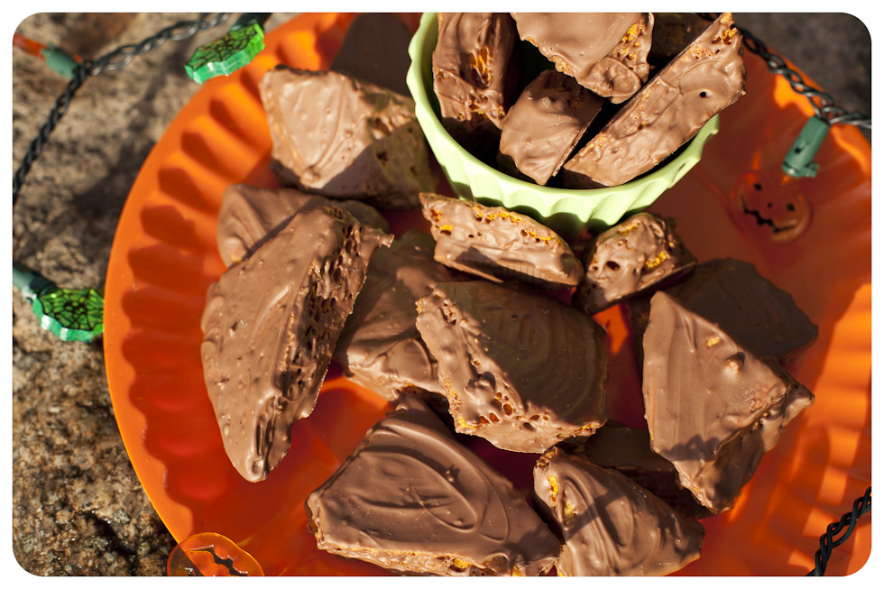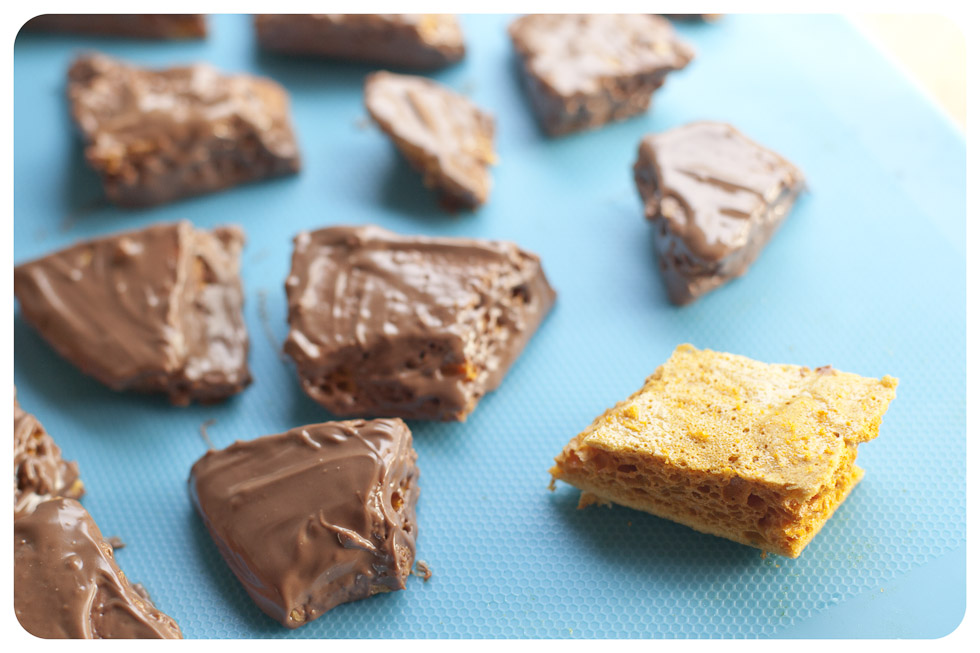 I actually just this minute made some hokey pokey for a bake sale tomorrow…and I was thinking of covering it in chocolate! Spooky or what? I absolutely love the stuff, being a Scottish lass my favourite sweetie when I was little was Ross’s Puff Candy! Hence why I have to make it and give most of it away…I’d just eat it all myself! 🙂