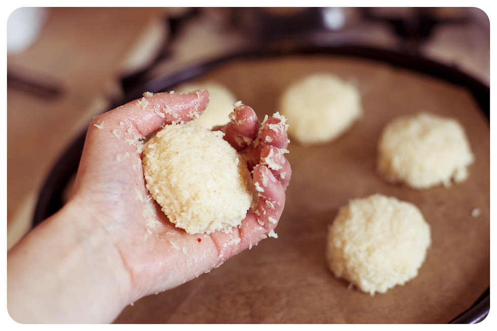 Either pack the mixture into an ice-cream scoop and drop onto your parchment covered baking sheet, or do as I did and mould golf ball sized portions of the mixture in your hand into rounded domes. Bake for about 12 minutes until they are just starting to colour, some of the coconut will catch and darken, which looks lovely.