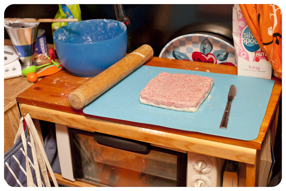 With the other half, work the freeze-dried raspberry powder in with your hands then do the same, flatten it roughly with your hands into a square and lay it over the white layer. Use your rolling-pin to work it out to the corners. The mix might feel a little dryer, this is because of the raspberry powder, it will set fine. Don’t worry if it doesn’t look very neat, you can tidy the edges when you come to cutting it into squares. Leave it to dry over night, I loosely folded over the edges of my silicon mat, it doesn’t need chilling or an air tight container.