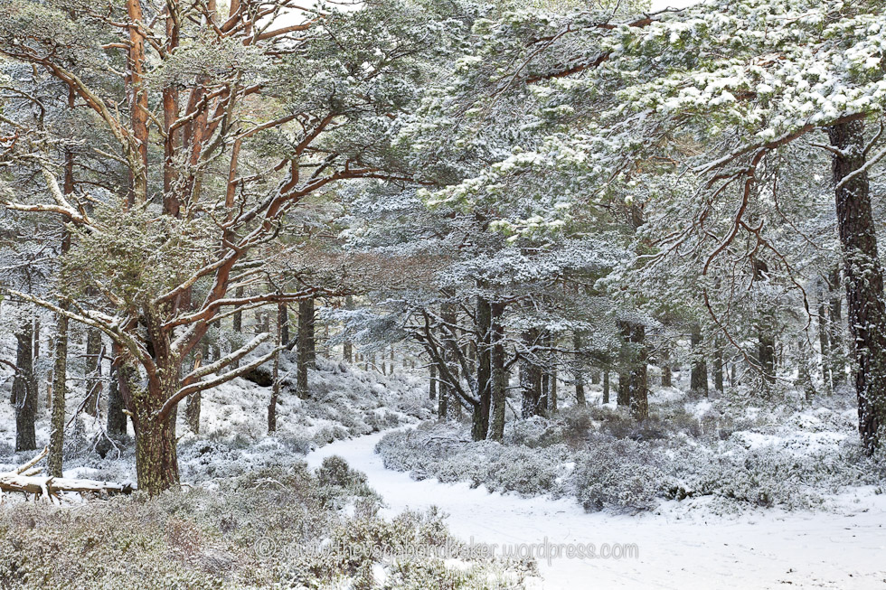 Another day was spent walking in the Rothiemurchus Estate, the pine forests looked magical dusted in snow. The small lochs were partially frozen over, the whole place was wonderfully atmospheric. Tony flushed out a pair of red deer as he walked ahead but they disappeared from sight into the trees. We found many animal tracks in the snow. It was one of those days where we had beautiful sunlight one minute then heavy snow and poor visibility then next.