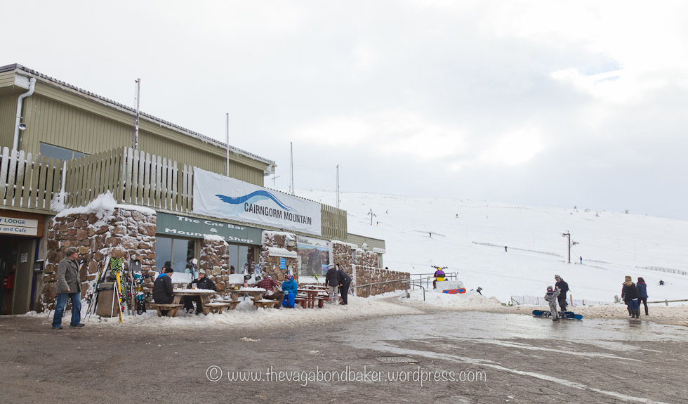 As well as a restaurant there is also a bar, shop, viewing terrace and exhibition. The restaurant was so busy, it was lunchtime, I had a hard time finding somewhere to sit among the brightly clothed skiers. I opted for a warming hot chocolate over a meal and had soup in the van when I returned to the car park. The mountain exhibition was interesting, geography, wildlife and mountaineering over the years. I bought a buff to keep my ears warm, as a souvenir in the shop. I’ve walked up the mountain before in glorious weather but never been inside the building. The food looked hearty and warming, masses of macaroni cheese {a Scottish favourite} for us veggies as well as jacket potatoes, soups and filled rolls.