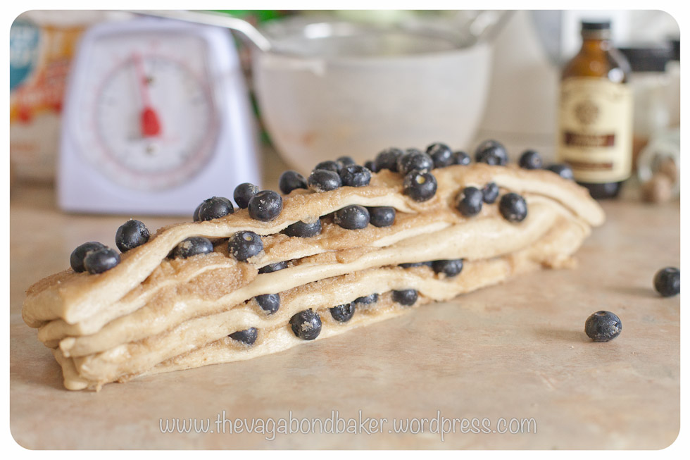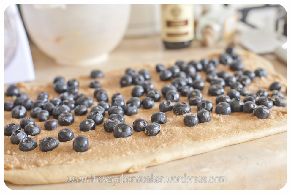 - Melt the butter in the microwave for 20 seconds, stir in the sugar, nutmeg, cinnamon and vanilla. Use a spoon to spread this mixture over the dough, right to the edges. Sprinkle the blueberries over the top and press them down slightly.