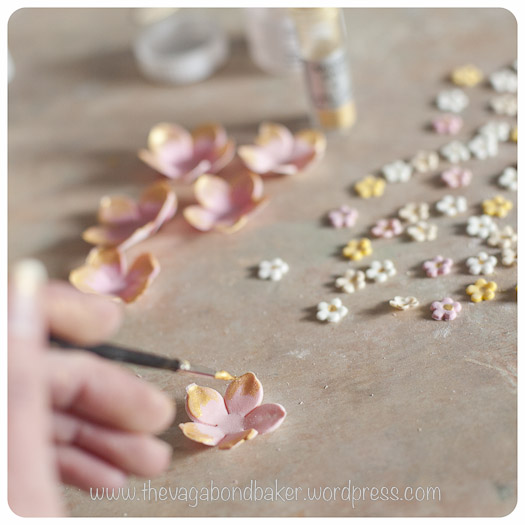 Once they are dry you can paint or dust lustre powder over them. I painted mine. Put a little heap of lustre powder onto a plate then add drops of rejuvenator spirit fluid, or vodka {I prefer the rejuvenator fluid as it comes in a handy dropper bottle}. Paint detail onto your flowers with a very fine paintbrush. I find the lustre paint needs regular ‘feeding’ with the rejuvenator spirit to keep it fluid, it’s very thirsty!