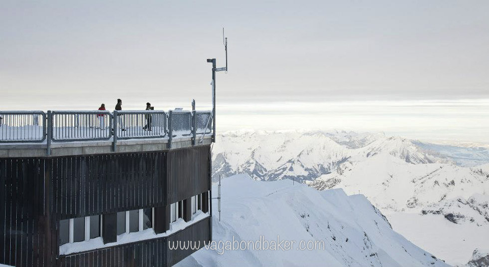 Piz Gloria is a restaurant perched on top of the Schilthorn Mountain, at 2970 m {9744 ft} which rises up above the Lauterbrunnen valley.