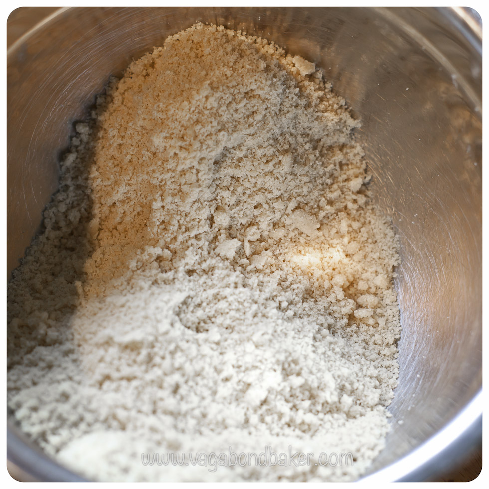 Cube the cold butter and add it to the bowl. Using fingertips, rub the butter into the flour and sugar until it becomes crumb-like.