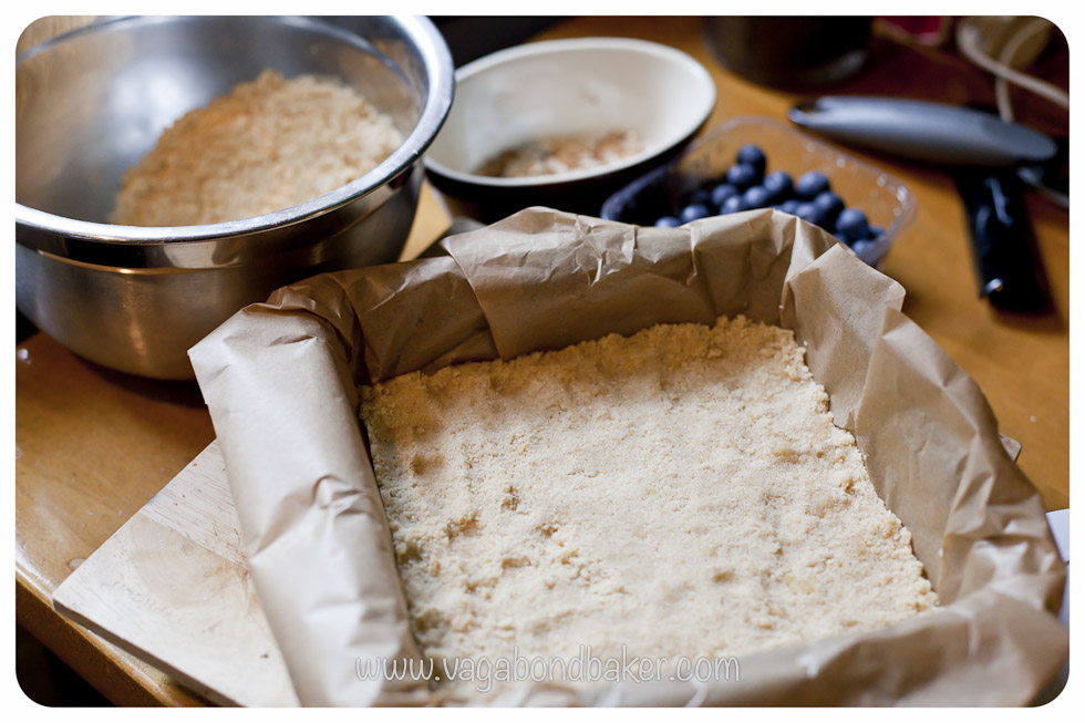 Lightly press a third of the mixture into the base of the lined tin. Add the blueberries and sprinkle over the cornflour. Shake the tin from side to side so the blueberries roll about and become coated in the cornflour.