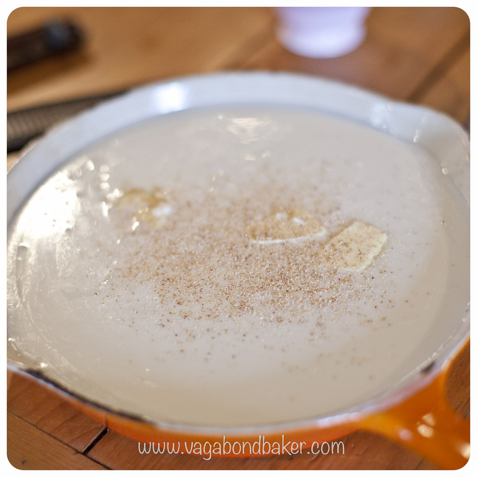 Place all of the ingredients into the shallow buttered oven-proof dish, pour over the milk and give it a little stir to settle everything. Make sure the vanilla pod is well buried if you are using one. Grate over a little nutmeg.