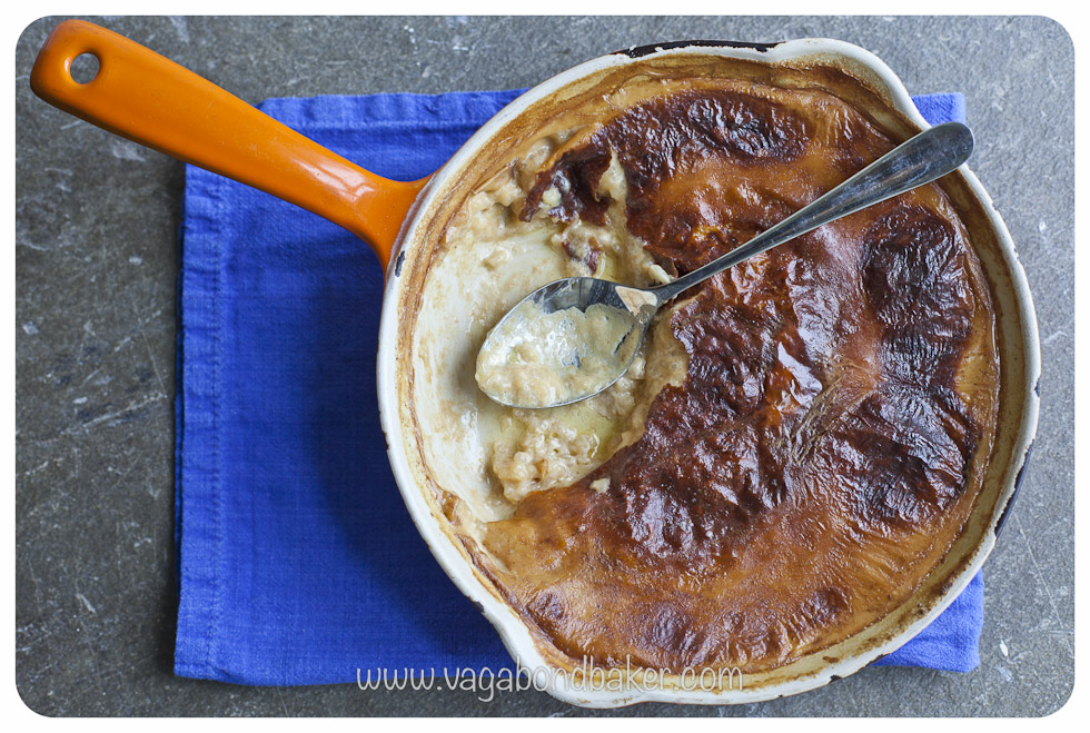 I’ve made it with regular milk and butter however you could easily make this vegan with marg and non-dairy milk. This recipe is based on one by Mary Berry, in her Aga book.