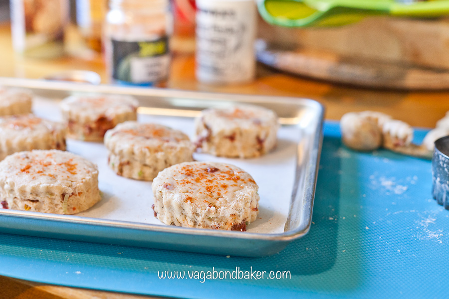 Transfer the scones to the baking sheet. Sprinkle a little pinch of cayenne pepper onto the top of each one.