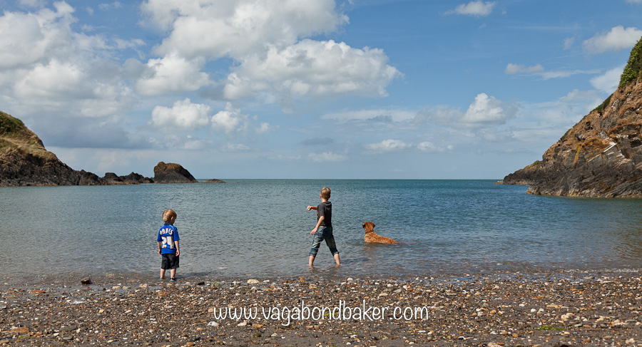 Our final few days in Wales were spent near Fishguard, I have wonderful relatives who live very near to Dinas head, many a childhood summer holiday was spent here. Another farm campsite, this time on the headland with lovely views along the coast was our base. A walk back down the farm track brought us out to the beach at Pwllgwaelod where there is a little pub and a footpath with cuts across the narrow base of Dinas head to the opposite side beach at Cwm-Yr-Eglwys a mile away. This pretty cove is perfect for a swim in the sea and its name translates as Valley of the Church. The church in question, St Brynachs, was mostly destroyed by a severe storm in the 19th Century, all that remains is the belfry wall making it a quaint, memorable place.