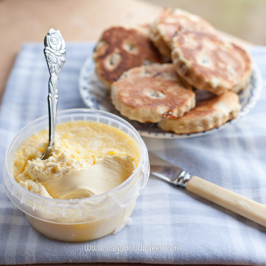 I’ve blogged Welsh Cakes before but I’m including them again as I made these to serve as a Welsh cream tea. Proving that all you need is a frying pan to make that quintessentially British treat, the cream tea. I had bought a tub of locally produced clotted cream from the farm shop at the campsite we were staying at in Pembrokeshire, just seeing that carton of creamy goodness in the shop counter gave me the inspiration to make Welsh cakes to serve with it.