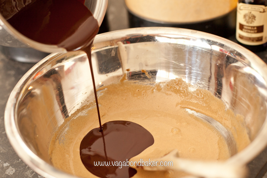 Beat the egg yolks, the brown sugar and the vanilla in a mixing bowl until thick and velvety, it should have increased in volume somewhat. Pour in the cooled chocolate and butter mixture and stir in.