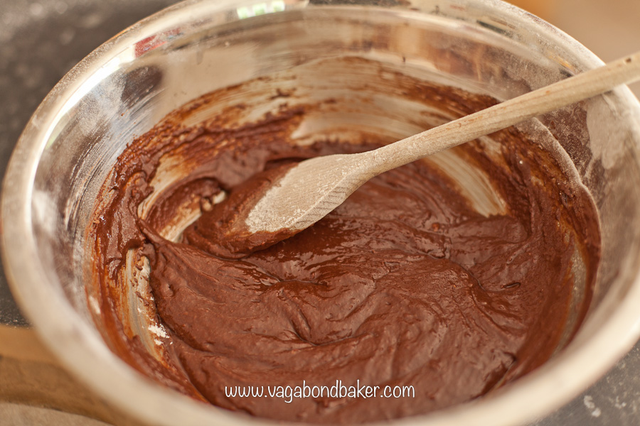 Combine the flour with the baking powder and the cornflour and sift into the chocolate batter then gently stir in until fully mixed.