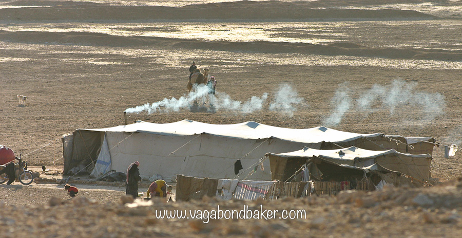 After about two hours we spied a Bedouin camp: a rectangular tent in the distance, smoke rising from it. One of the guides sped off to see if it was the right one.