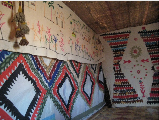 The inside of the tent was decorated with embroidered wall hangings. The young girls had embroidered wonderful images of everyday Bedouin life: there were camels, mosques, and palm trees, along side petrol stations and trucks.