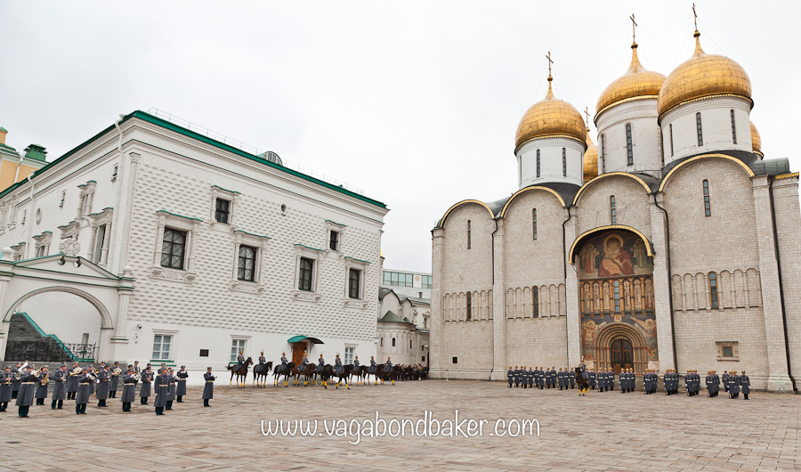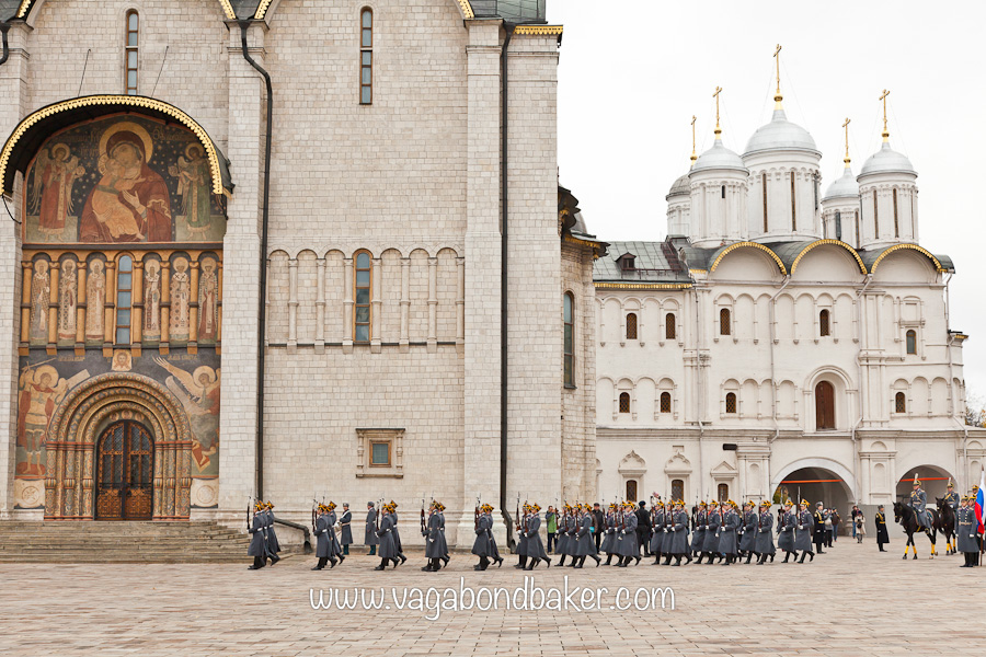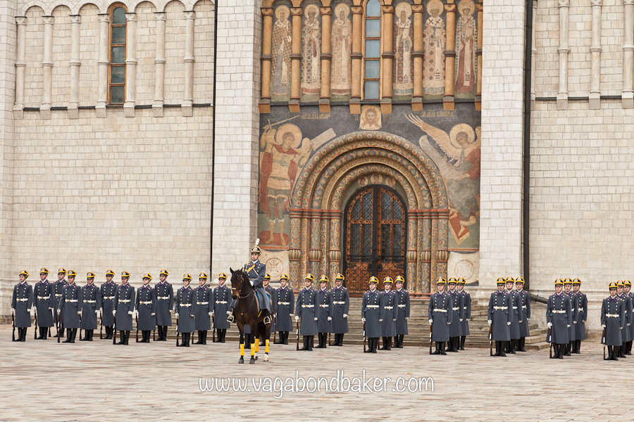 On Saturdays at noon {Mid May to Mid October} the Presidential Regiment perform a ceremonial procession in Sobornaya Place {Cathedral Square} inside the Kremlin. So we chose this time to visit the red-walled citadel, seat of the Russian government.