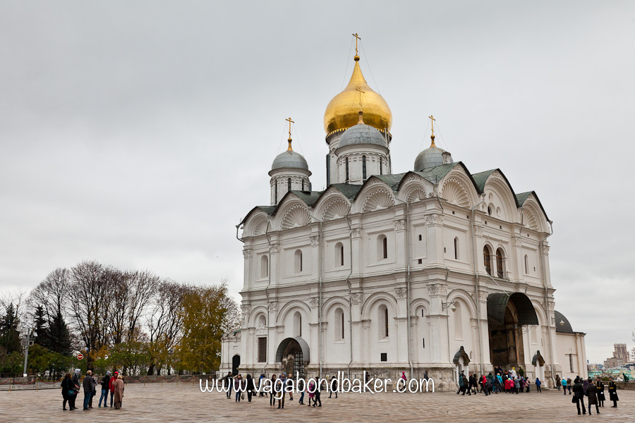 The Kremlin is entered through the imposing Trinity Gate Tower, you pass the Arsenal with its line of cannons before arriving into the central square around which stand the Kremlin’s four main cathedrals.