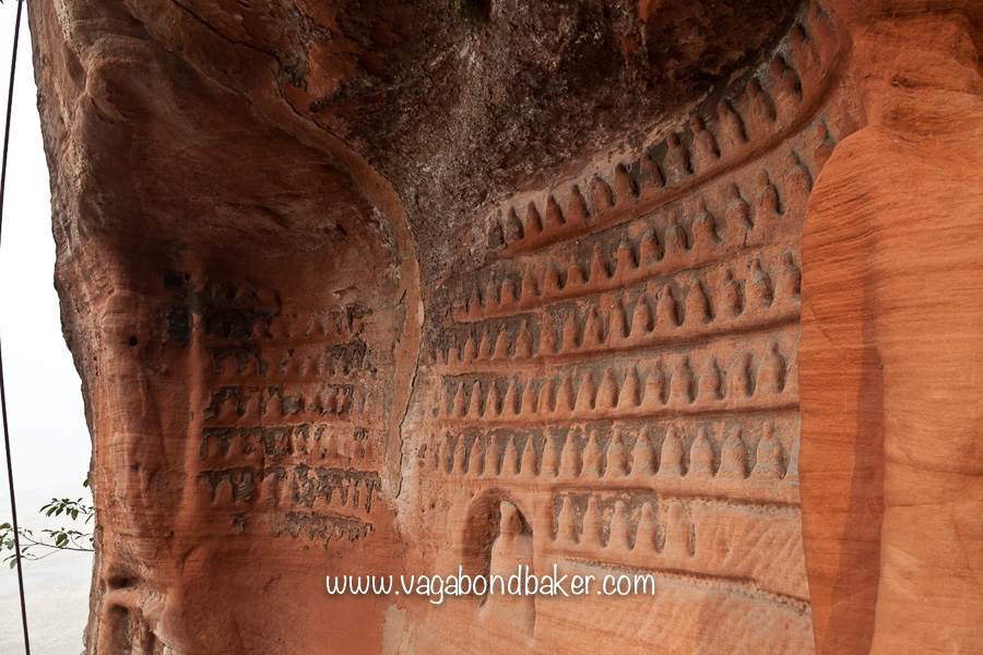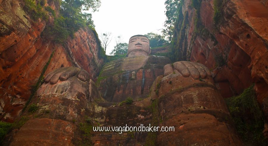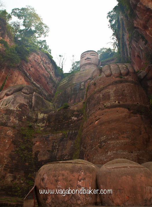 Going down the steps, passing well-worn Buddhas in niches cut into the rock-face, the size of this Buddha becomes remarkably apparent, he is carved into a seated position and is 71 meters high from the bottom of his feet to the top of his head.