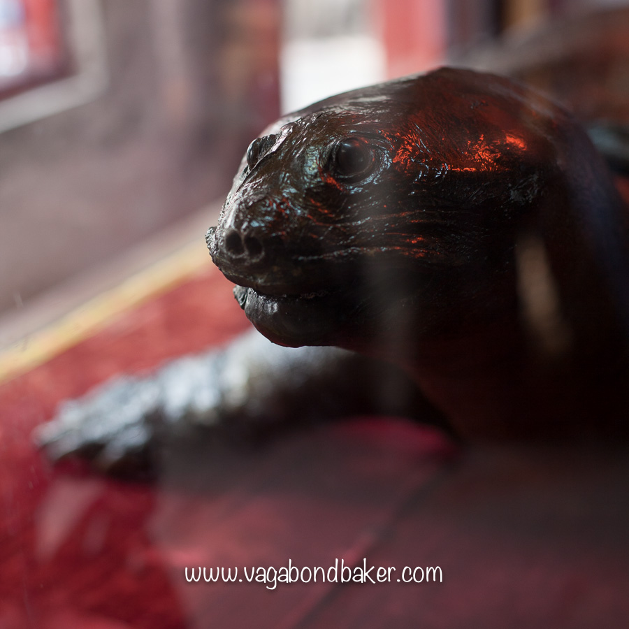 Hoan Kiem translates as the Lake of the Returned Sword, like something from Arthurian legend, the story goes that Le Loi defeated the Chinese Ming Dynasty, gave Vietnam independence and became King using a magical sword forged in the watery underworld. A few years later he was out boating one day on the lake when a huge turtle appeared and took the sword, returning it to whence it came. Since that time, the giant soft-shelled turtles living in the lake have become sacred and as mysterious as Nessie. The preserved turtle isn’t the actual turtle of the legend, but he’s probably as close as you are going to get.