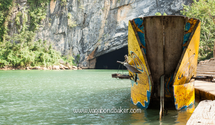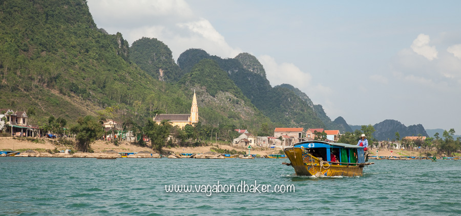We made some great friends on the National Park tour and the following day a few of us cycled to Son Trach to visit Phong Nha Cave, the original show cave in the park. This cave is only accessible by boat, the ticket office situated on the river near the entrance to the village. It’s a 5 km boat ride along the river to the cave and the boats can carry 14 people. We managed to join a small group of other tourists at the counter, this cut the price for us to hire the boat.