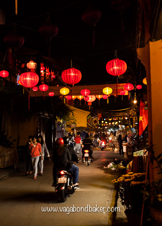 As we made our way towards the river on the first night, along the narrow streets strung with lanterns, we became part of a larger crowd heading in the same direction. This crowd had an element of chaos as motorbikes sliced noisily though it, parting it momentarily. Hoi An seemed a hell of a lot busier than I remembered it, but this was Tet {Vietnamese New Year} and the crowds were inevitable.
