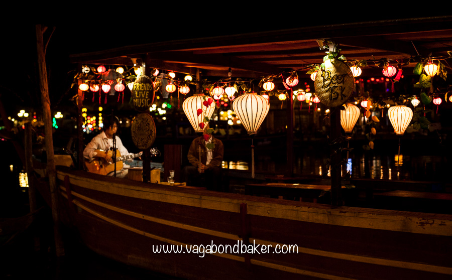 It’s once the sun sets that Hoi An changes its face, the yellow buildings de-saturate and the lanes are hung with red lanterns to light your passage to restaurants or the river. Down by the water the town comes to life, raucous musicians belt out music while young girls sell lanterns to the milling tourists to cast their wishes afloat.
