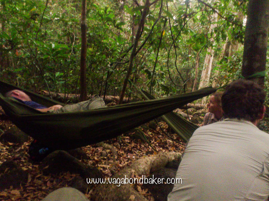 Torches in hand, or on head, we hiked into the jungle with the guide until we came to a clearing, it was still completely dark and the walk throughout the forest was exciting. We were handed bananas to nibble on while the guide strung up some hammocks.