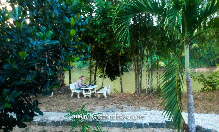 We stayed at Green Hope Lodge, in a prettily decorated bungalow that overlooked the river, there was even WiFi! While the room was lovely, it was quite quiet and for our first evening meal the four of us took a wander down towards the Park Entrance to see what else was on offer. We found the wonderful balcony at Green Bamboo Lodge, which hung out over the river and was the perfect spot to watch the sun set, and this became our go-to place for food and company.