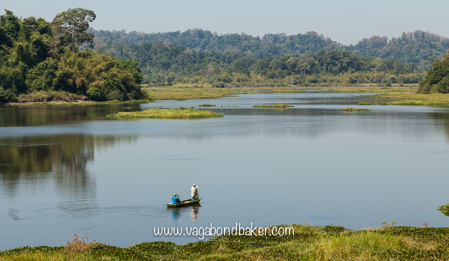 Sure enough however, it was a crocodile. Chris and a couple of others rushed down to the lake-side to photograph it. I stayed put with the rest of the group up on the viewing platform and watched it from a super-safe distance through my binoculars. The fishermen had dropped some dead fish into the pool, to attract the crocodiles while they headed out into the big lake with their net.