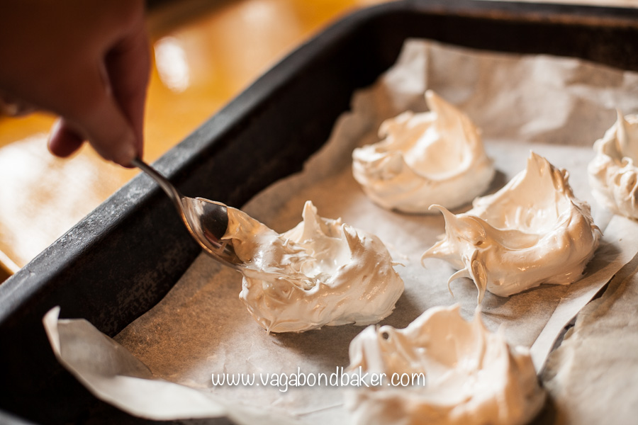 I’ve used the ‘hot sugar’ meringue method here, where the sugar is quickly heated up in the oven before adding to the beaten egg whites, think of it as a cross between the French and Italian meringue techniques. The hot sugar dissolves better into the egg whites.