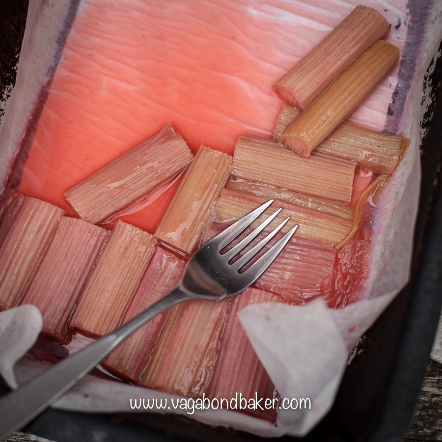 - Pop back into the oven, this time without a cover, and continue cooking for about 5 more minutes or until soft but keep your eye on them, a few minutes can turn them from neat little fingers of rhubarb to stewed rhubarb. The cooking time will depend on the thickness of the rhubarb.