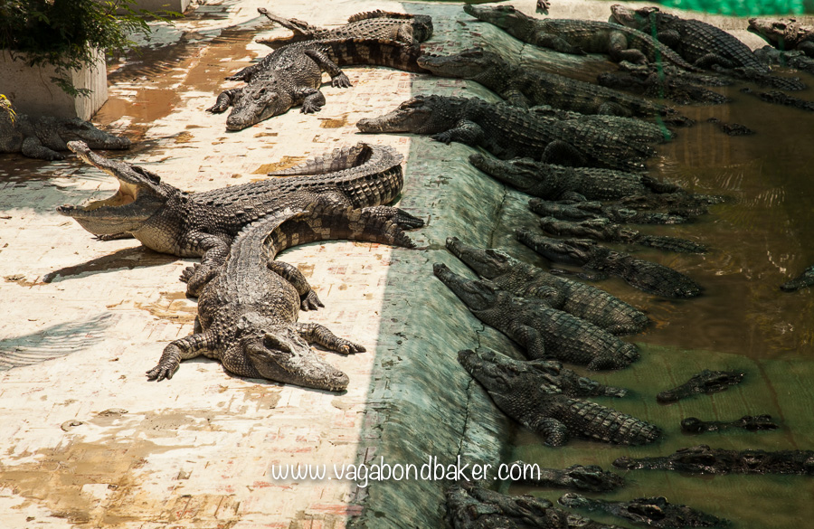 The crocodiles were basking in the sun, contained in concrete enclosures, and there were hundreds of them. A raised walkway kept us out of snapping range, the crocodiles eyeballing us as we moved along.