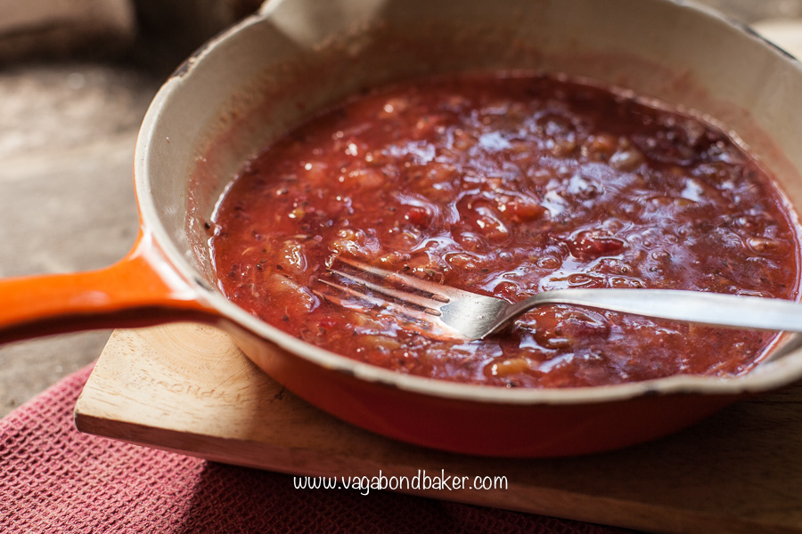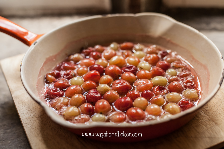 The gooseberries just need a little sugar to sweeten them as they roast in the oven, I mashed them before filling the roulade. You could, if you wish, push the mashed gooseberries through a sieve to remove the seeds and skins but I didn’t bother as I like the texture, or you could leave them whole to stud the whipped cream filling.