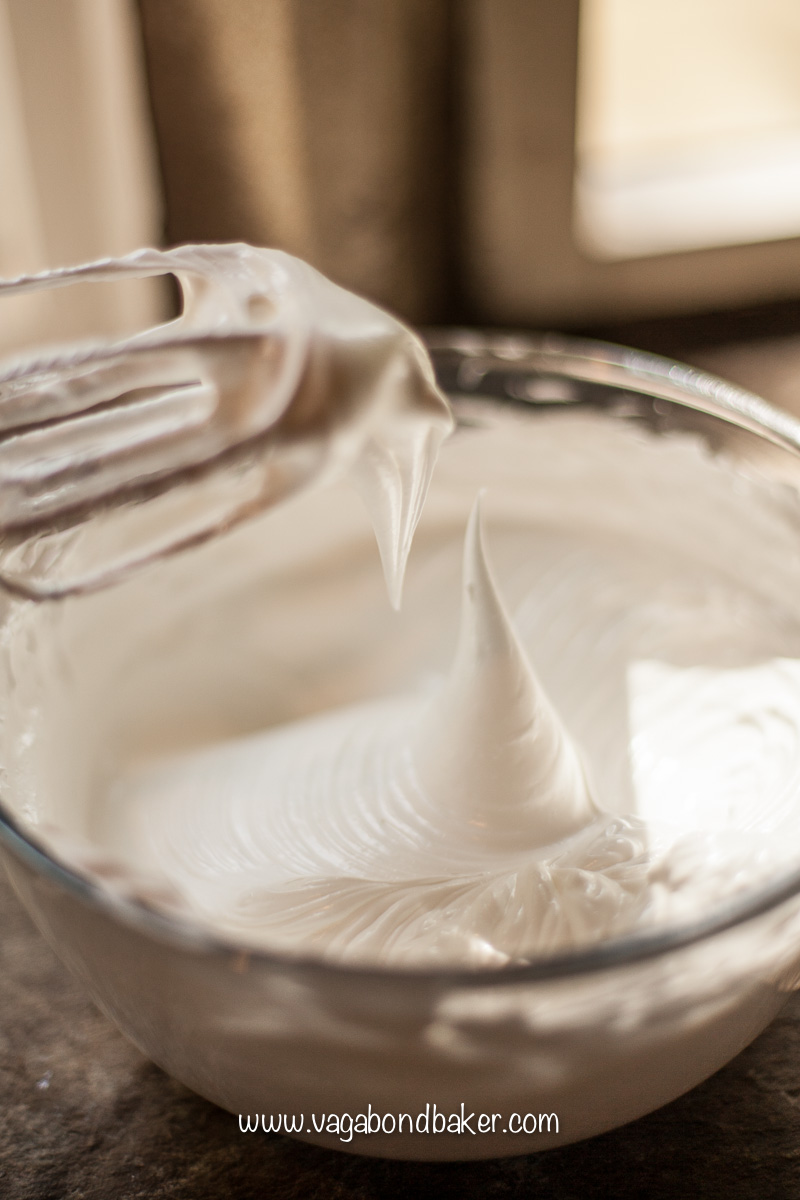 Once all the sugar is added, keep beating until the meringue is thick and glossy. It should feel grit-free when squished between the fingers.