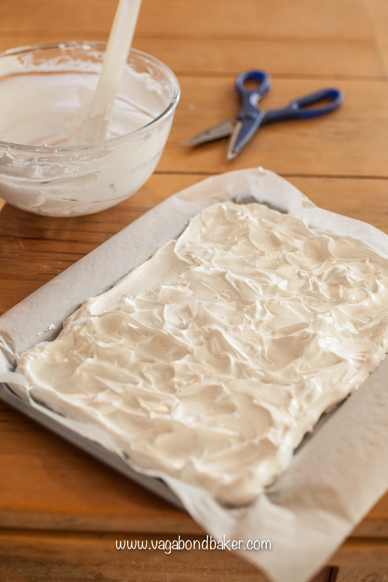 - Turn the warm meringue out onto a fresh sheet of parchment then carefully peel the paper off the base. Allow to cool, this won’t take long.