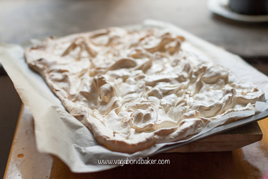 To make the meringue I used 50 grams of sugar per egg white, a little less than if I was making regular meringues.