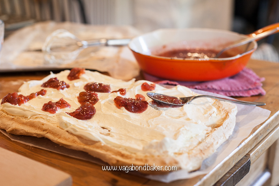 - Score a line along one of the long edges a couple of centimetres in, then whip the cream to soft peaks and spread it over the surface of the meringue.
