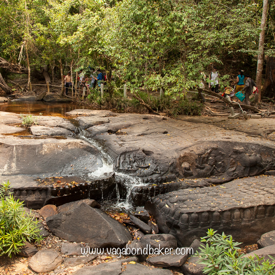 - Kbal Spean, this isn’t a temple, it’s much more earthly than that. 45 Km north of Siem Reap, beyond a 45 minute walk through some tangled forest lies a carved river bed of hundreds of linga while Hindu carvings decorate the waterfall. Kbal Spean is a telling insight into the ancient reverence to water, this site was clearly sacred to the ancient Khmers and is fascinating to visit. The lower bit of the river can be swum during the wet season. It closes at 3pm so best visited first.