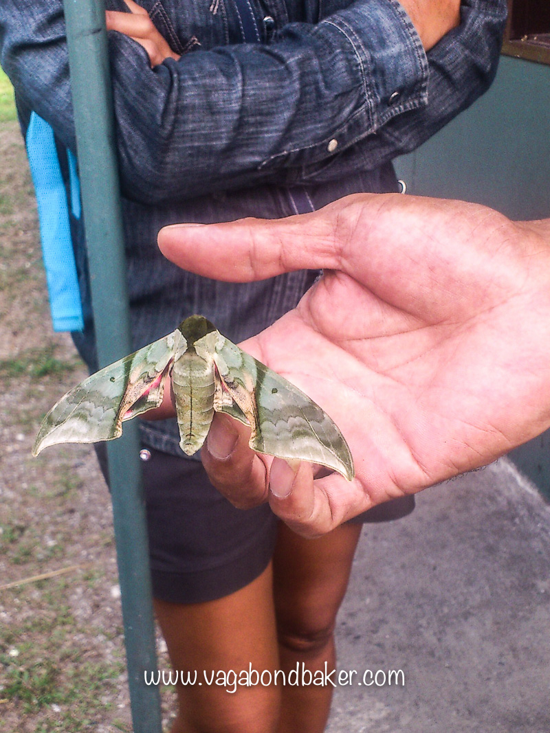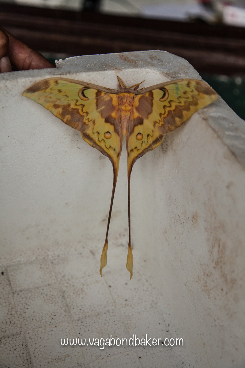 From within their little hut they produced a spectacular Malaysia Moon moth which Mr Nine brought over to show us, along with an equally spectacular Lesser Green and Pink Hawk moth.