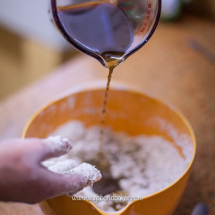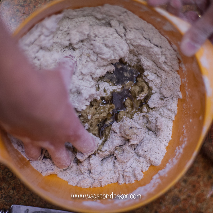- Combine the rye flour, the white flour and the yeast in a large mixing bowl then slowly add the sweetened warm water, bringing it altogether into a rough dough with your hands.