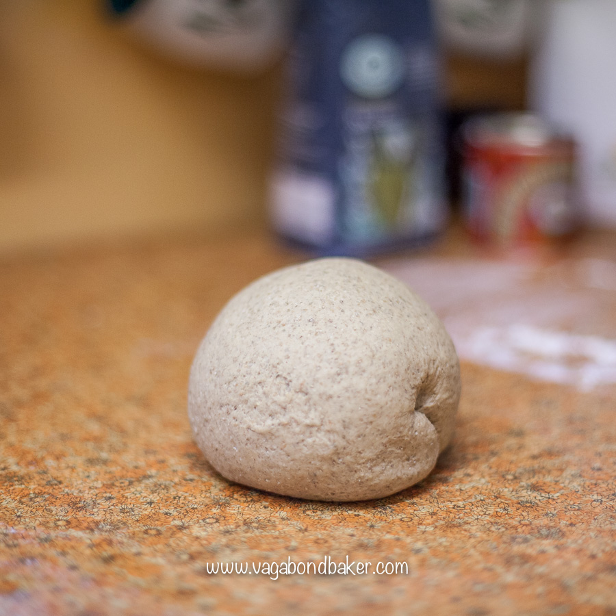 Now add a tablespoon of melted butter, or oil, mixing it in. Knead the dough for about 5 minutes or so until the dough relaxes into a dense, fairly smooth ball. Add a little more white flour or water if necessary. You could certainly do this in a mixer with a dough hook.