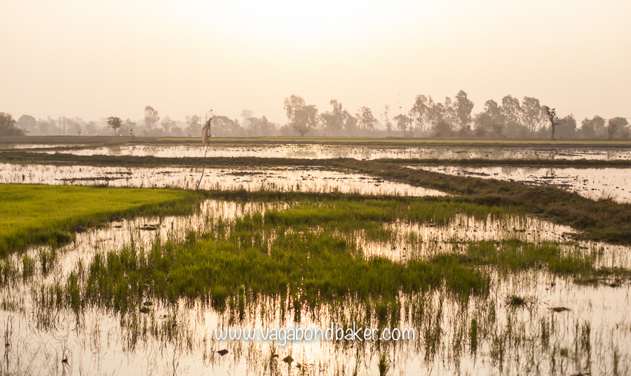 I must have eventually slept for a good few hours and woke somewhat refreshed around six. The light was beautiful, the morning sun reflecting in flooded rice paddies.