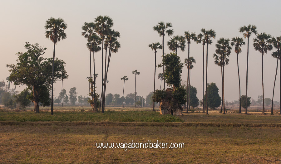 I spotted a small ruined temple, very reminiscent of Angkor and shrouded in foliage, it rose from the flat plain amongst some tall palms. Everyone else went to the restaurant car for breakfast but I stayed in the quiet compartment enjoying the peace, the light and the scenery passing by beyond the open window.
