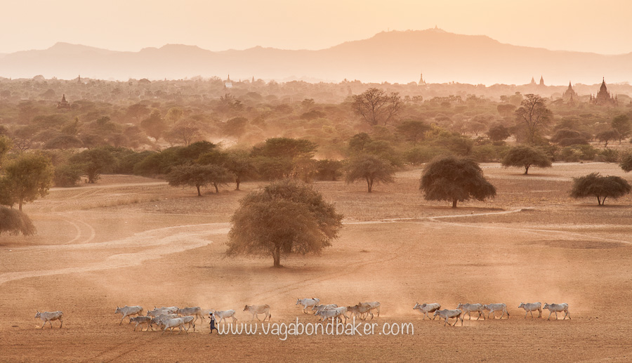 The sun began to descend washing hazy golden light over the temple studded plain. A farmer drove a small herd of cattle across the plain in front of us, beautifully backlit by the setting sun; it completed the scene, a timeless moment to end our time in Bagan.