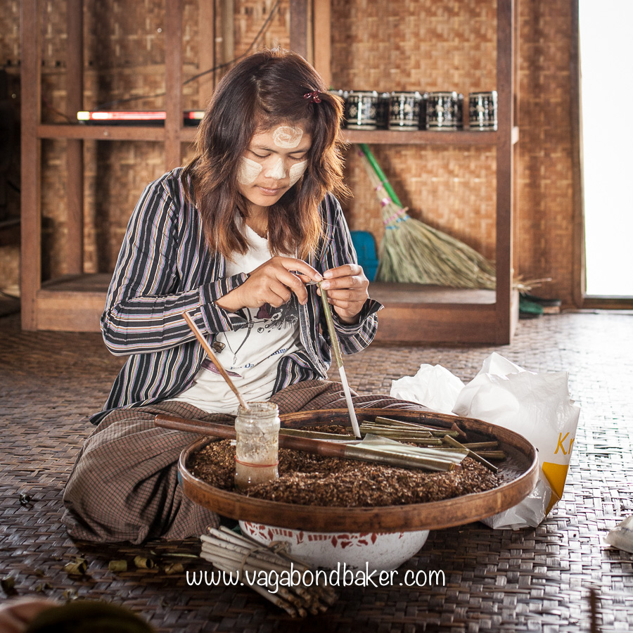 Our destination here was a cheroot factory where we were ushered in to see three young women hand rolling small cigars and cigarettes. Each of the girls were sat cross-legged on the floor with a wide dish, piled with fragrant tobacco, between their knees.