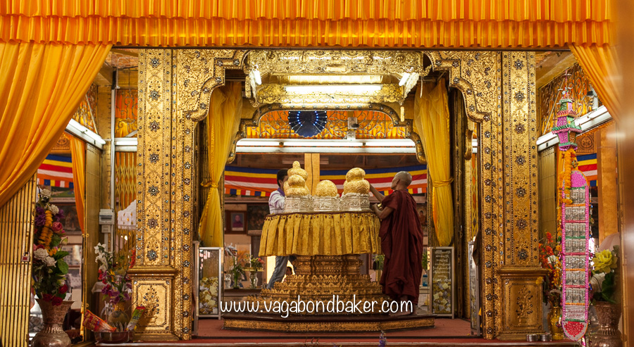 Next stop on the lake was the Paung Daw Oo Paya, a big temple on the edge of the lake. Inside, after paying the tourist entrance fee and the camera fee, the temple was focused on a golden, roofed platform in the middle of the room. At it’s heart some men and a monk were adding gold leaf to five lava-like blobs; which, I discovered after reading the pictorial stories around the walls of the temple, were images of Buddha.