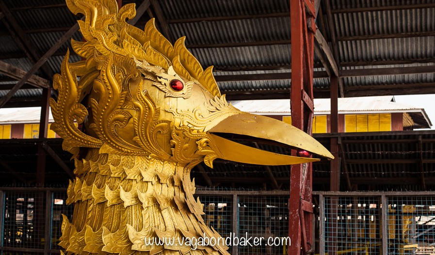 Once a year the golden images are transported across the lake in the Paung Daw Oo festival, on an elaborate barge shaped like a Hintha, a mythical golden swan. The barge was moored in a large shed next to the temple and we wandered over to have a look. Between it’s golden wings I could see where the tray of Buddha images would sit.