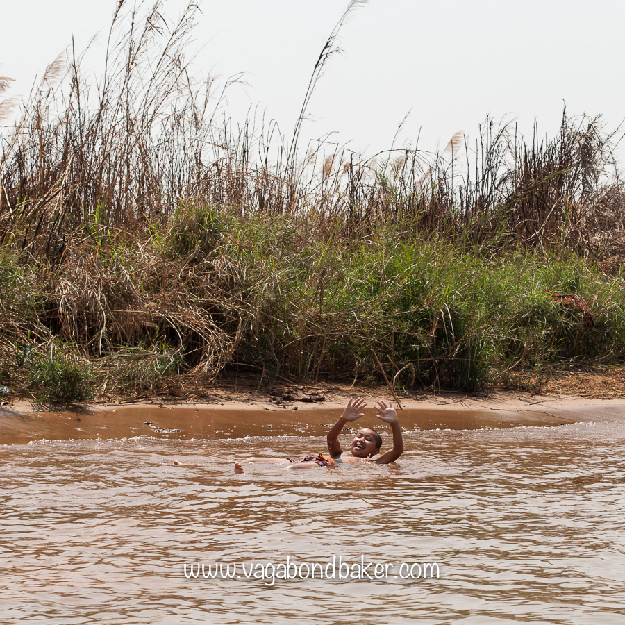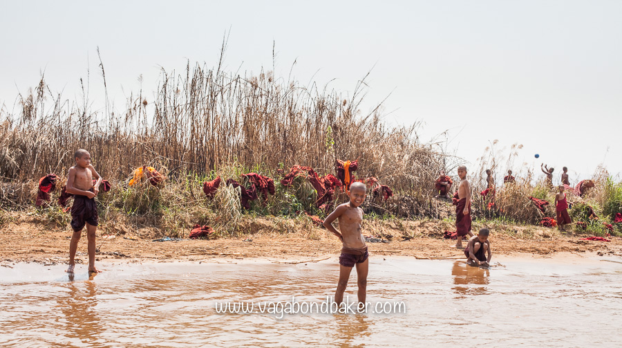 On a bend in the canal we found a large group of young monks who were bathing in the murky water; they waved gleefully at us, their red robes draped over the grassy bank behind them.
