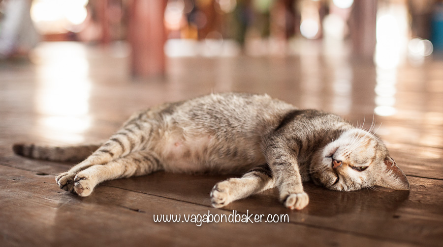 We boated to our final destination of the day, the Nga Hpe Kyaung: the Jumping Cat Monastery. In the past, the monks taught the temple cats to jump through hoops during their free time; this, in turn, became a tourist draw. The temple was lovely, dark and cool; the cats were evident as soon as we stepped inside.