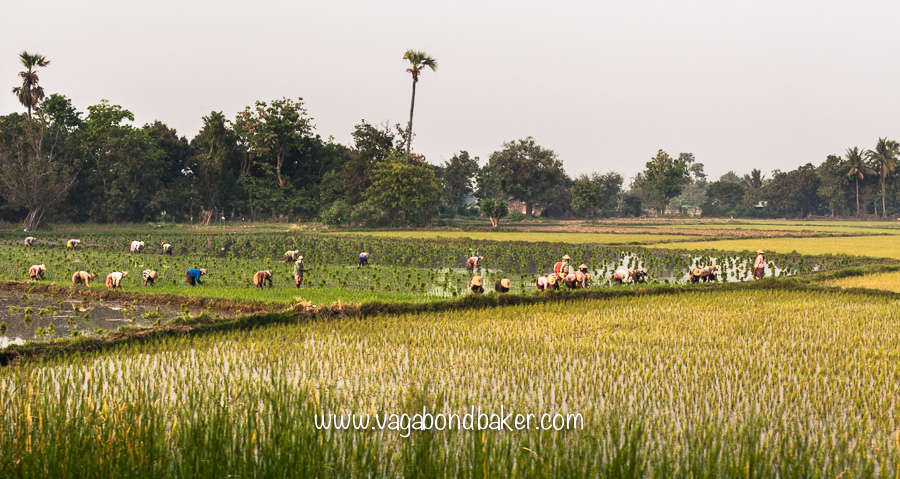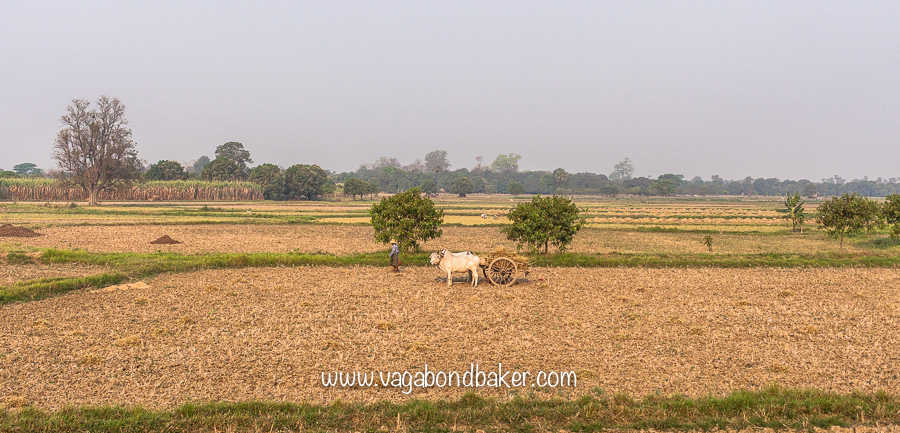 We passed rustic scenes of farming life: bullocks pulling ploughs and turning wells; rice paddies with cone-hatted workers. These pastoral scenes continued and repeated until we neared Mandalay; then the landscape became more urban: brick walls, barb wire, warehouses and abundant, depressing litter.